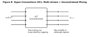这就是 Hyper-Connections(HC)这类工作的出发点:把残差流的宽度从 C 扩到 n×C,并引入一个可学习的混合矩阵,把“各条车道”的信息在每层重新路由。在 HC 原论文里,核心机制就是这种“复制 n 份 residual path、再在它们之间做连接”的宏观结构。